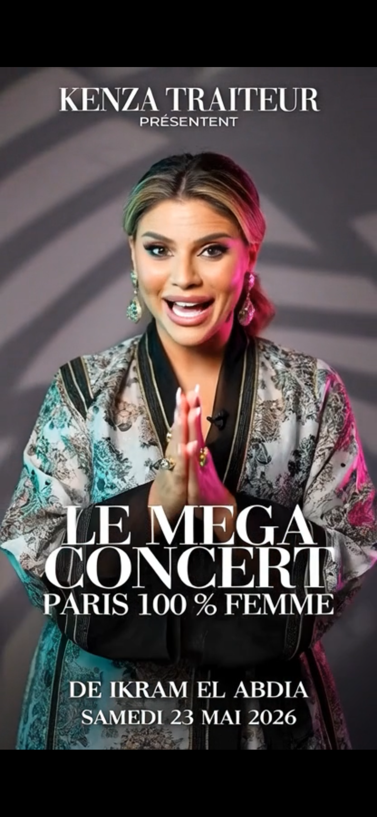 Kenza traiteur vous présentent sa soirée concert 100 % femme avec la diva IKRAM EL ABDIA EN EXCLUSIVITÉ CHEZ NOUS le samedi 23 mai 2026 au palais Shah nawaz 93800 Epinay sur Seine de 19h à 3 h avec  DJ FEMME        2 forfaits au choix                                         ✅catégorie 1 65 € avec entrée+ dîner compris plat +dessert + boisson à volonté ✅catégorie 2 45€ entrée+boisson à volonté