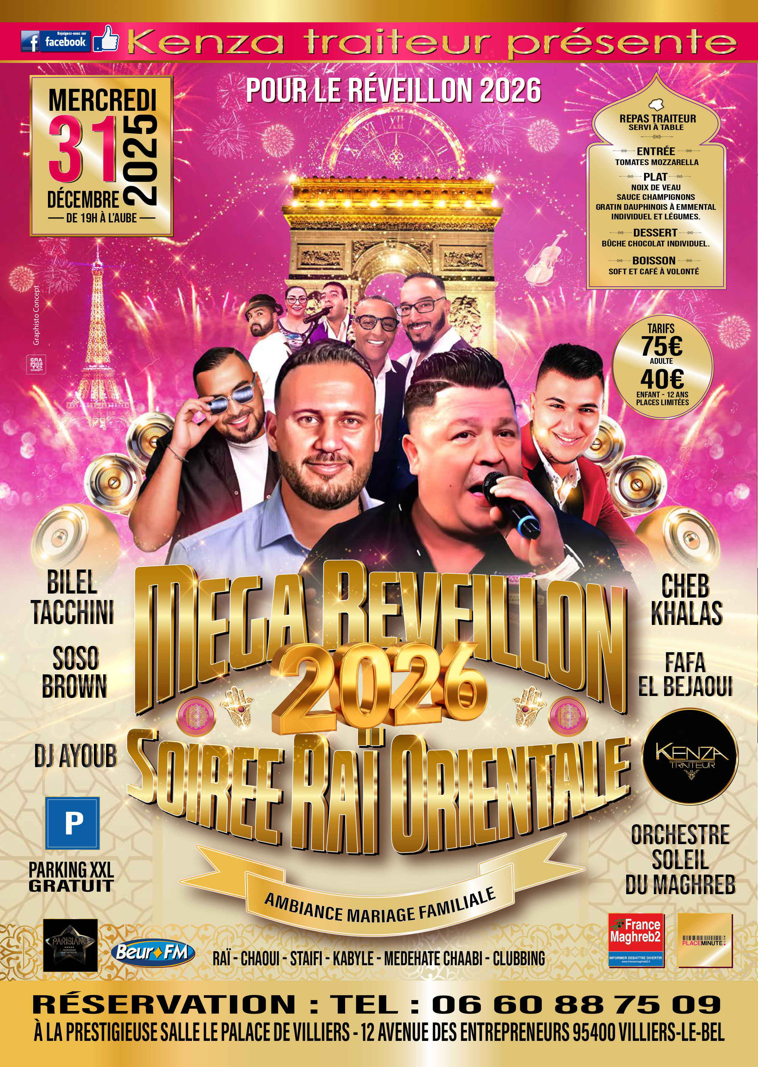 le méga RÉVEILLON rai orientale ambiance mariage de Kenza traiteur c'est le MERCREDI 31 décembre au PALACE DE VILLIER À VILLIER LE BEL